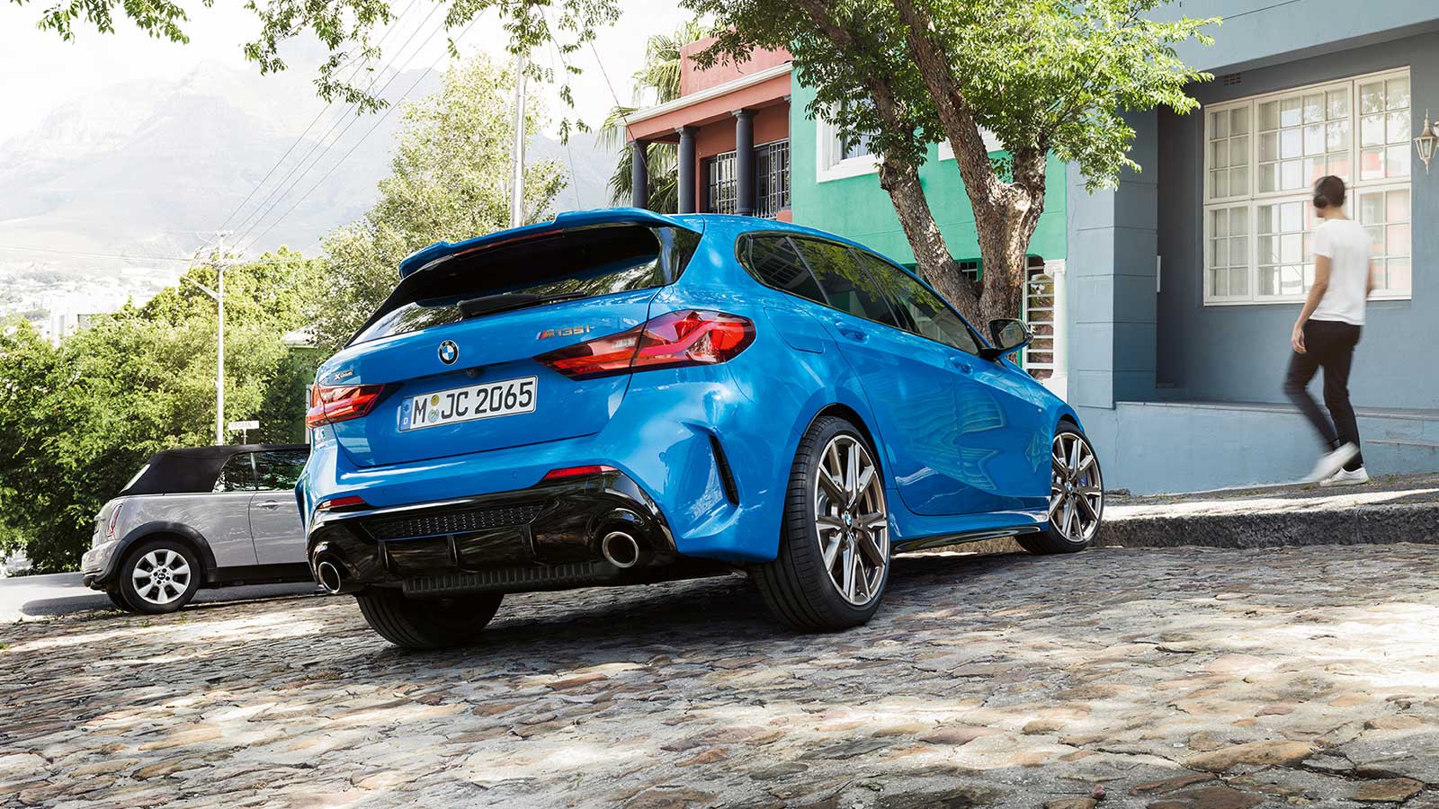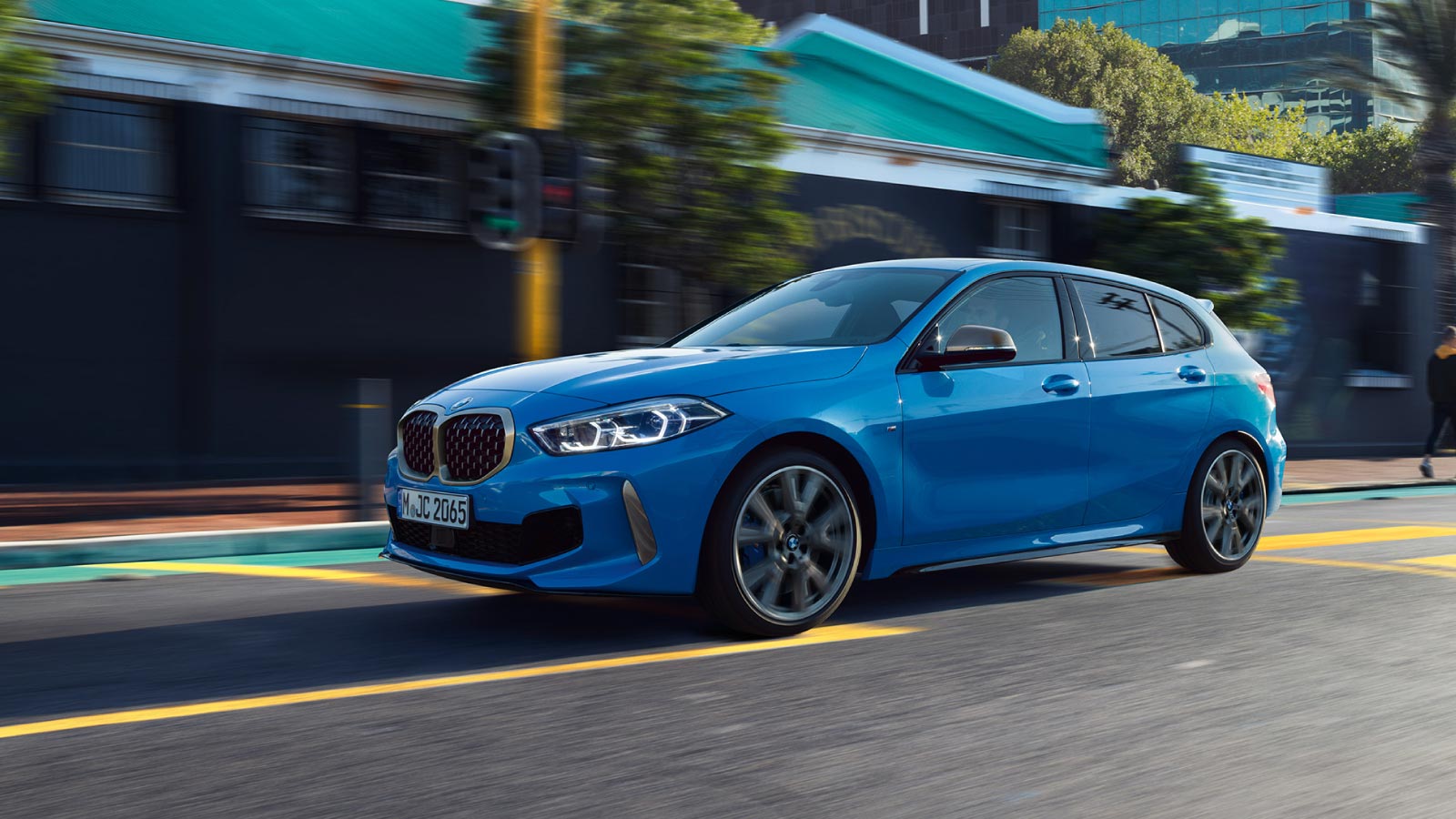 A real head-turner: the sporty and progressive design of the new BMW M135i xDrivecould almost have been created to attract admiring glances in record time. The extremely distinctive front with large air inlets, prominent double kidney grille in mesh design and slopingAdaptive LED headlights ensures a memorable first impression. Impressive 19'' light-alloy wheels along with the dynamic contours emphasisethe athletic character of the vehicle. Dominating at the back are the broad rear apron with its diffuser look and the two large 100-mm tailpipes in Cerium Grey. The interior of the BMW M135i xDriveinspires just as quickly: M Sport seats, illuminated decorative trim finishers and the large Panorama glass roof create an especially dynamic and generous premium ambience.
